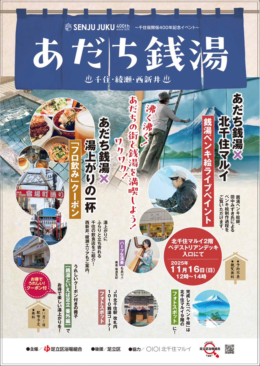 当日は、足立区の後援により、65歳以上の方、小学生乳幼児の子は特別入浴料です!寒い季節になってきましたので、この機会に銭湯で温まってください♨️